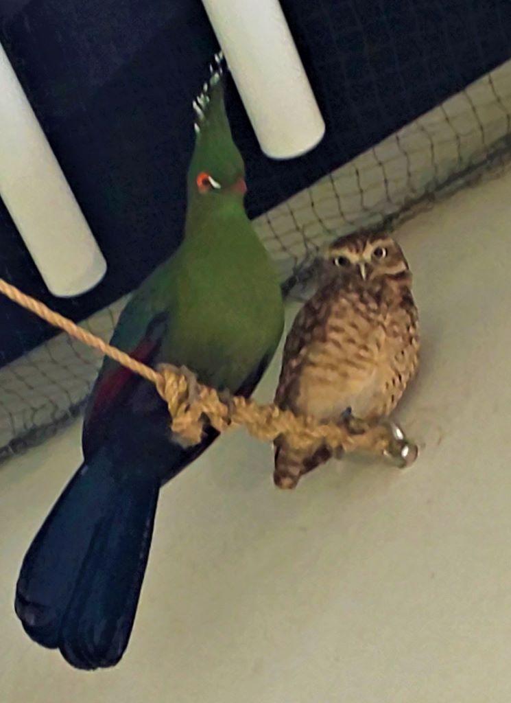 シャローエボシドリとアナホリフクロウが並んで止まっていました。一緒に並んで止まっているのは初めて見たので、珍しいなと思い写真を撮っていると、
