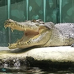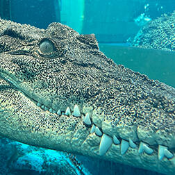 水槽の底でじっとしているイリエワニ。